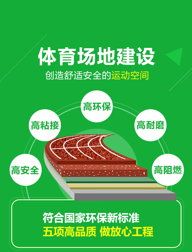 承接工程:篮球场、网球场、壁球场、羽毛球场、乒乓球场、排球场、塑胶跑道、足球场、攀岩及其他预定场地的设备和安全营造技术。材料有硬地塑胶丙烯酸、弹性丙烯酸、硅PU聚氨酯、橡胶、人造草坪及PVC卷材层面铺设,室内外人工攀岩墙、运动场地灯光配套系统。